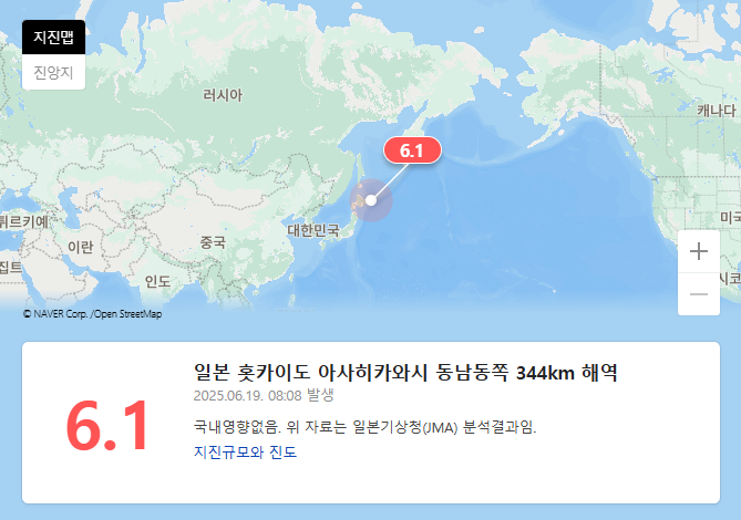 - 홋카이도 연안 권역에 규모 6.1, 깊이 13~14 km 지진 발생